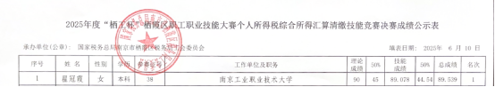 6月10日,2025年度“栖工杯”栖霞区职工职业技能大赛个人所得税综合所得汇算清缴技能竞赛决赛成绩公示,8868官方网站计划财务处选派的教师代表翟冠霞在激烈竞争中脱颖而出,以总分第一名的优异成绩斩获大赛冠军。