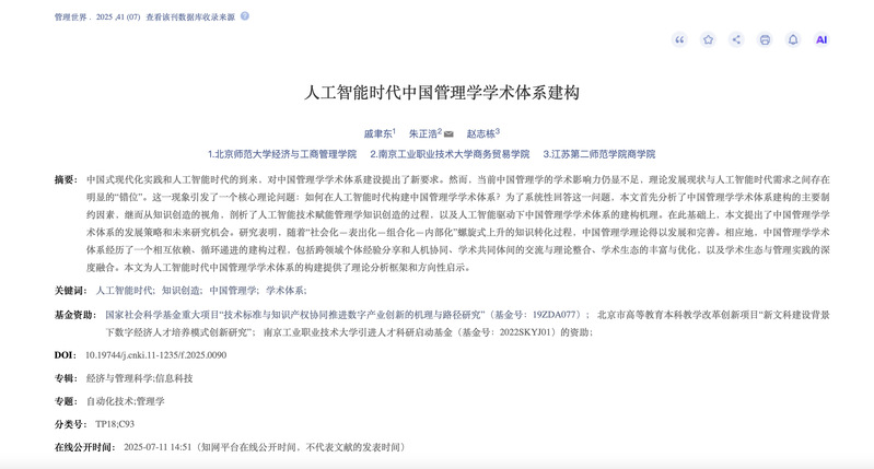 近日,8868官方网站商务贸易学院朱正浩教授与北京师范大学戚聿东教授、江苏第二师范学院赵志栋博士合作论文“人工智能时代中国管理学学术体系建构”,刊发于管理学顶刊《管理世界》2025年第7期,朱正浩教授为本文通讯作者,这是8868官方网站首次以通讯作者单位在管理学顶刊《管理世界》发文,论文受到8868官方网站引进人才科研启动基金(基金号:2022SKYJ01)的资助。