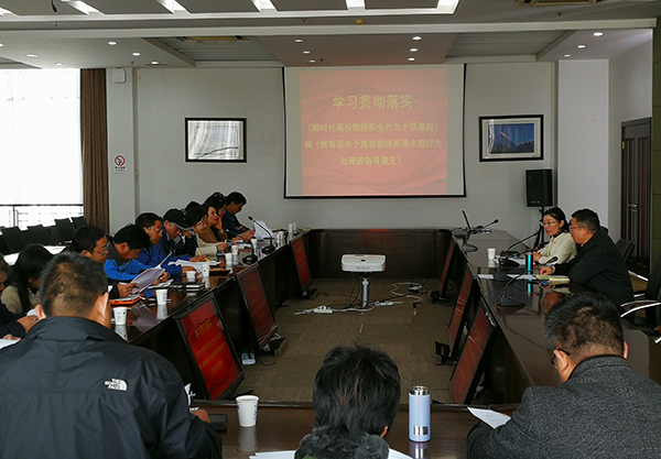 教育部近日制定并印发了《新时代高校教师职业行为十项准则》(教师〔2018〕16号,以下简称《准则》)以及《关于高校教师师德失范行为处理的指导意见》(教师〔2018〕17号)文件。11月20日下午,8868官方网站在行政楼辅楼二楼会议室召开专题会议,学习文件精神并进行工作部署。副校长朱建国出席了会议,各二级学院(部、中心)党政负责人参加了会议。