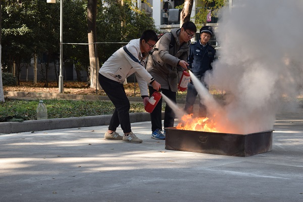 本次活动主要分为消防安全知识讲解、灭火器材使用方法及模拟火场实战演练三个部分。孙军伟首先向同学们强调了提高消防安全意识的重要性以及开展消防演练活动的必要性,希望同学们通过此次演练提高应对突发事件的能力。随后,消防科工作人员向大家详细讲解了手提式干粉灭火器的正确使用方法及注意事项,并进行现场演示。同学们在认真学习观摩后,纷纷动手使用消防器材,体验了灭火过程,进一步提高了消防技能。期间现场进行了消防知识问答,同学们积极回答,现场气氛热烈。
