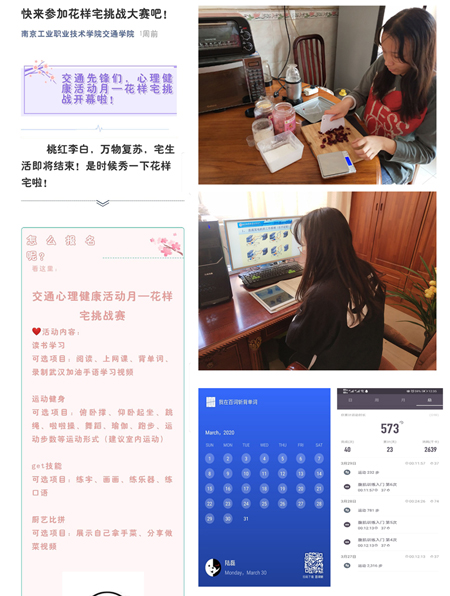 “花样宅挑战赛”活动拉开学院本学期心理健康活动月系列活动的序幕,学院将针对三个年级学生的不同阶段特点,分别开展毕业生就业形势和心理调适线上讲座、“疫情之我见”征文、“情绪调节有妙招”等丰富多样的线上活动。通过线上活动引导学生用理性平和、积极向上的健康心态应对当下的学习和生活,帮助同学们树立防疫信心,保持良好心态,提高同学们的心理健康知识水平,建立战“疫”必胜的信心。