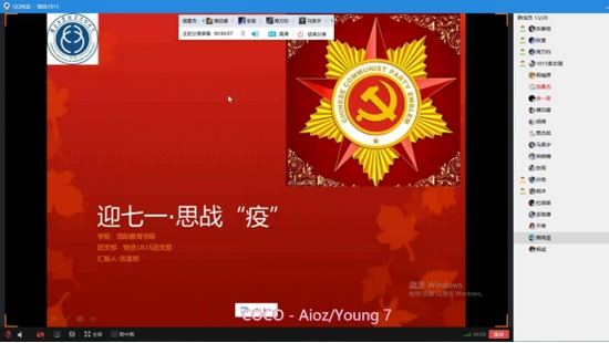 为隆重纪念中国共产党建党99周年,7月1日,国际教育学院组织全体同学通过线上收看、个人学习、云班会等方式,收看了由教育部思政司指导的高校党组织战“疫”示范微党课“七一”专场。